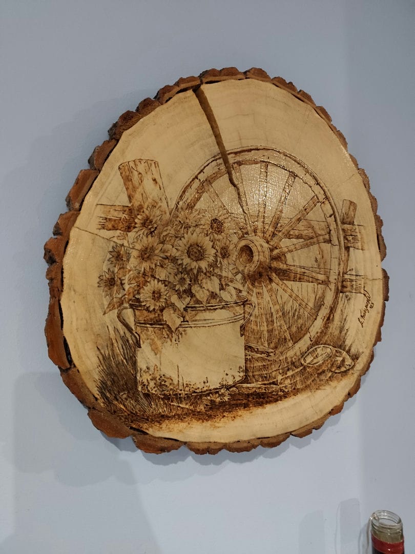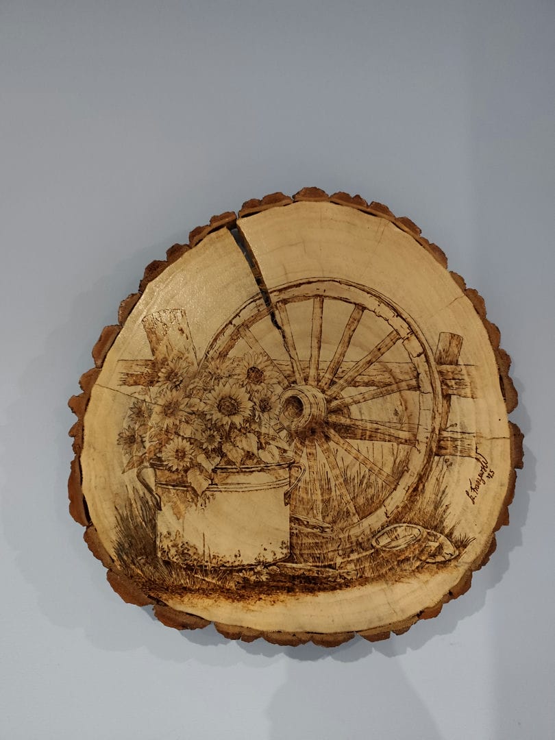 Przedstawiam unikatowe, autorskie dzieło – pirografię (wypalanie) na naturalnym plastrze drewna topoli. Rustykalny motyw: antyczne koło wozowe i bukiet misternie wypalonych słoneczników. Ta praca to efekt 36 godzin precyzyjnego, mistrzowskiego rzemiosła. Drewno jest lakierowane dla trwałości i podkreślenia detali. Ze względu na włożony czas, kunszt i unikalny materiał, jest to nie tylko dekoracja, ale inwestycja w sztukę. Zainteresowanych zakupem tego unikalnego elementu wystroju zapraszam.