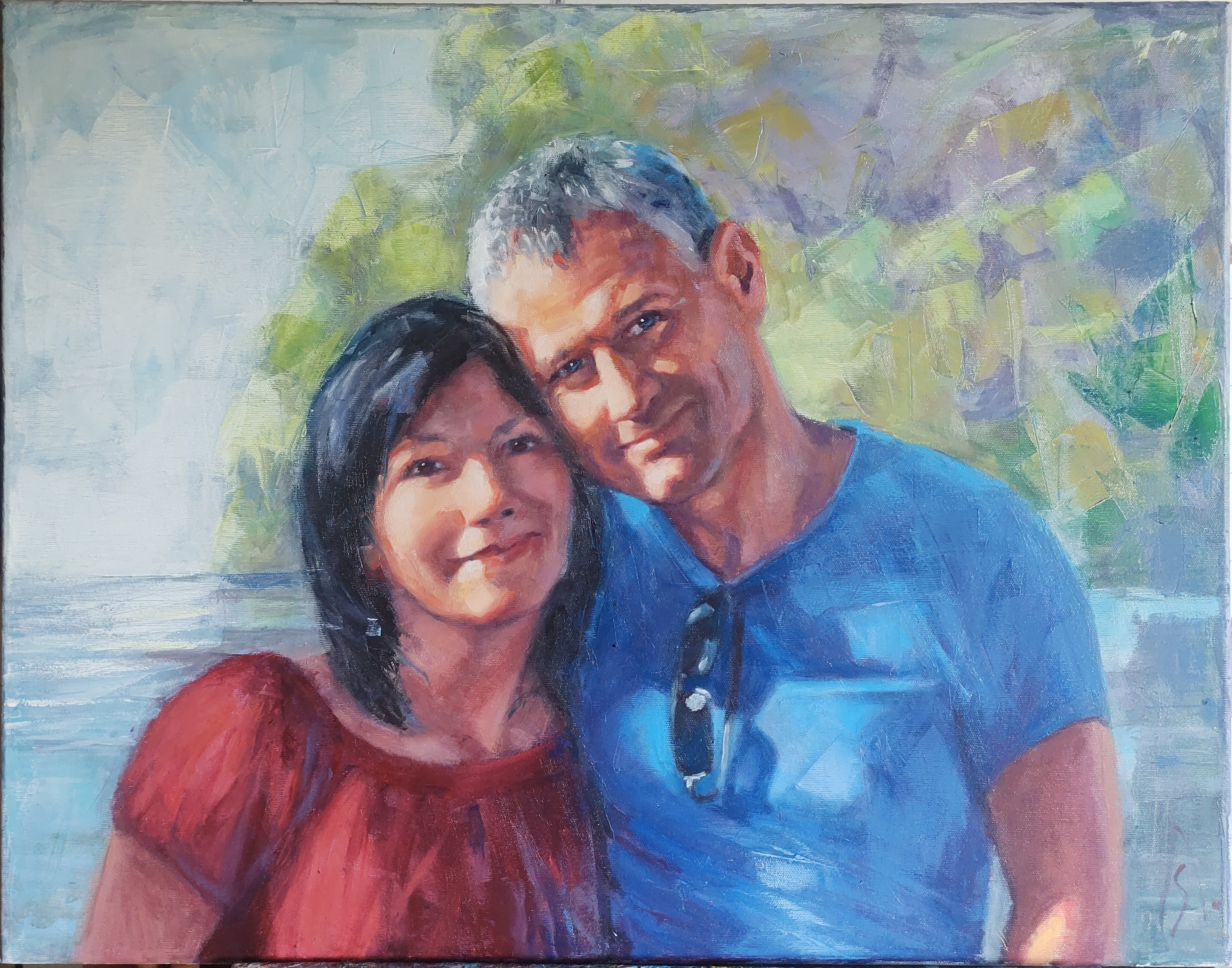 Portret olejny na płótnie 40/50 cm wykonany na zamówienie z przesłanego zdjęcia w podobnym stylu jak na zdjęciach. Stylizacja i szczegóły do uzgodnienia. Wysokiej jakości płótno bawełniane lub lniane na blejtramie wykonanym z solidnych profili drewnianych. Bardzo ważna jest jakość przesłanego zdjęcia. Czas realizacji to 1 miesiąc ze względu na czas schnięcia obrazu. Bardzo fajny pomysł na prezent. Wyceniam indywidualnie w zależności od skomplikowania zlecenia.