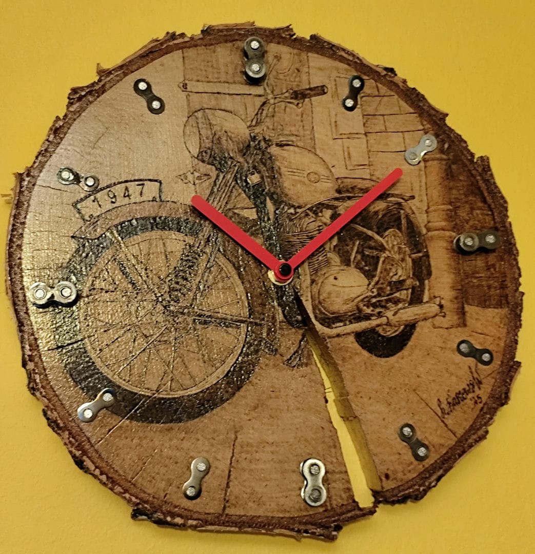 Zegar Pirograficzny 'Motocykl 1947' - Rękodzieło Unikalny zegar ścienny, wykonany z plastra brzozy (śr. ok. 23-25 cm). Wzór motocykla wypalony techniką pirografii (27 godz. pracy!). Cechy: Indeksy z ogniwa łańcucha motocyklowego. Cichy mechanizm kwarcowy. Drewno lakierowane. Idealny prezent vintage!