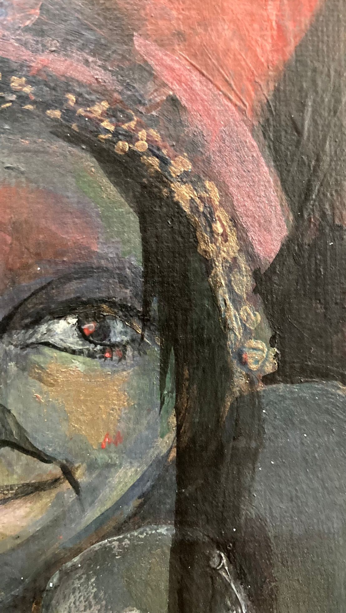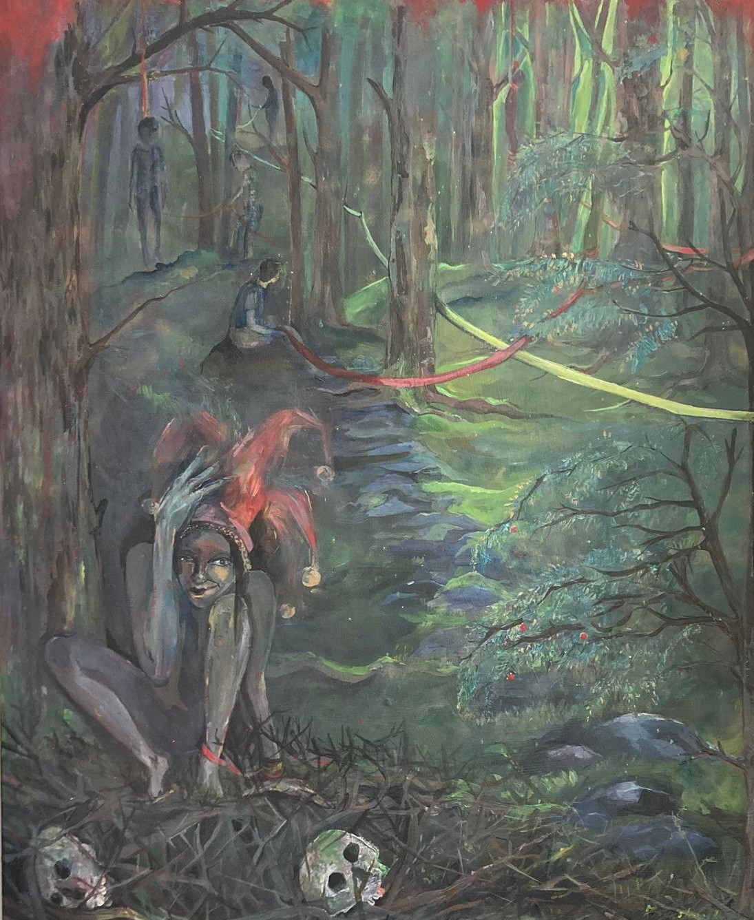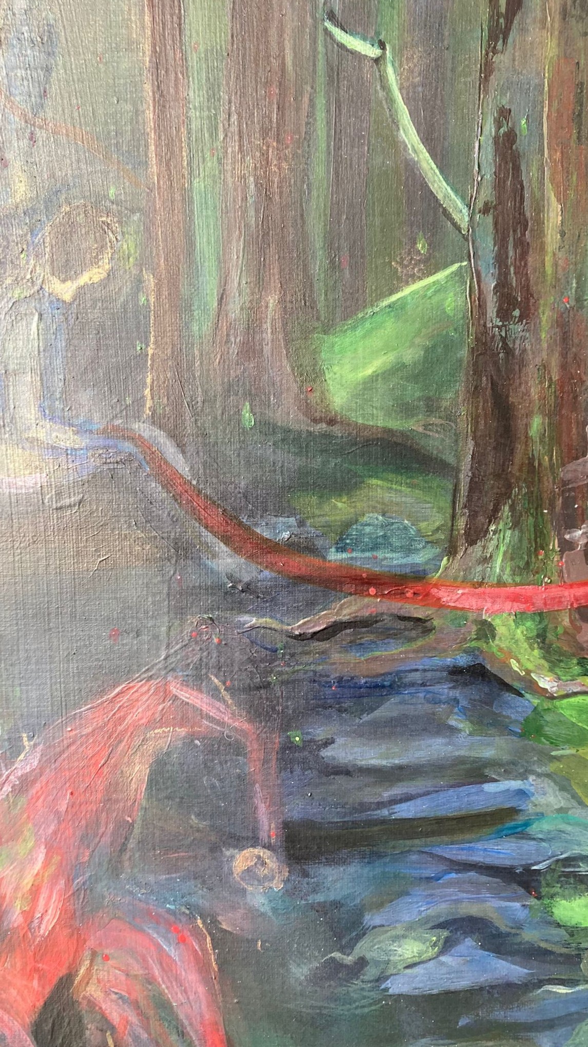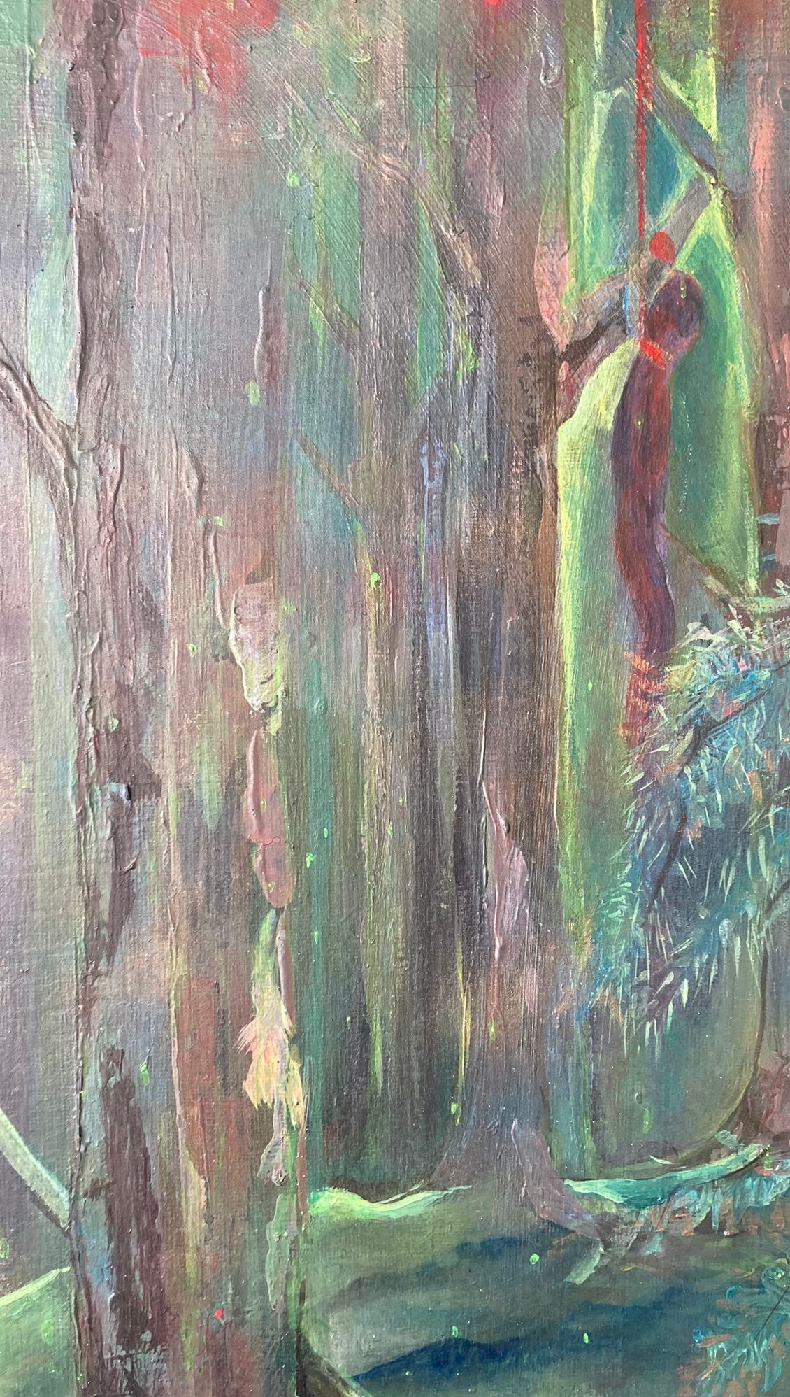 Akryl na podobraziu, werniks satynowy, wymiary cm 100x80. Pełen symboliki, niepokojący obraz inspirowany mrocznym lasem Japonii.