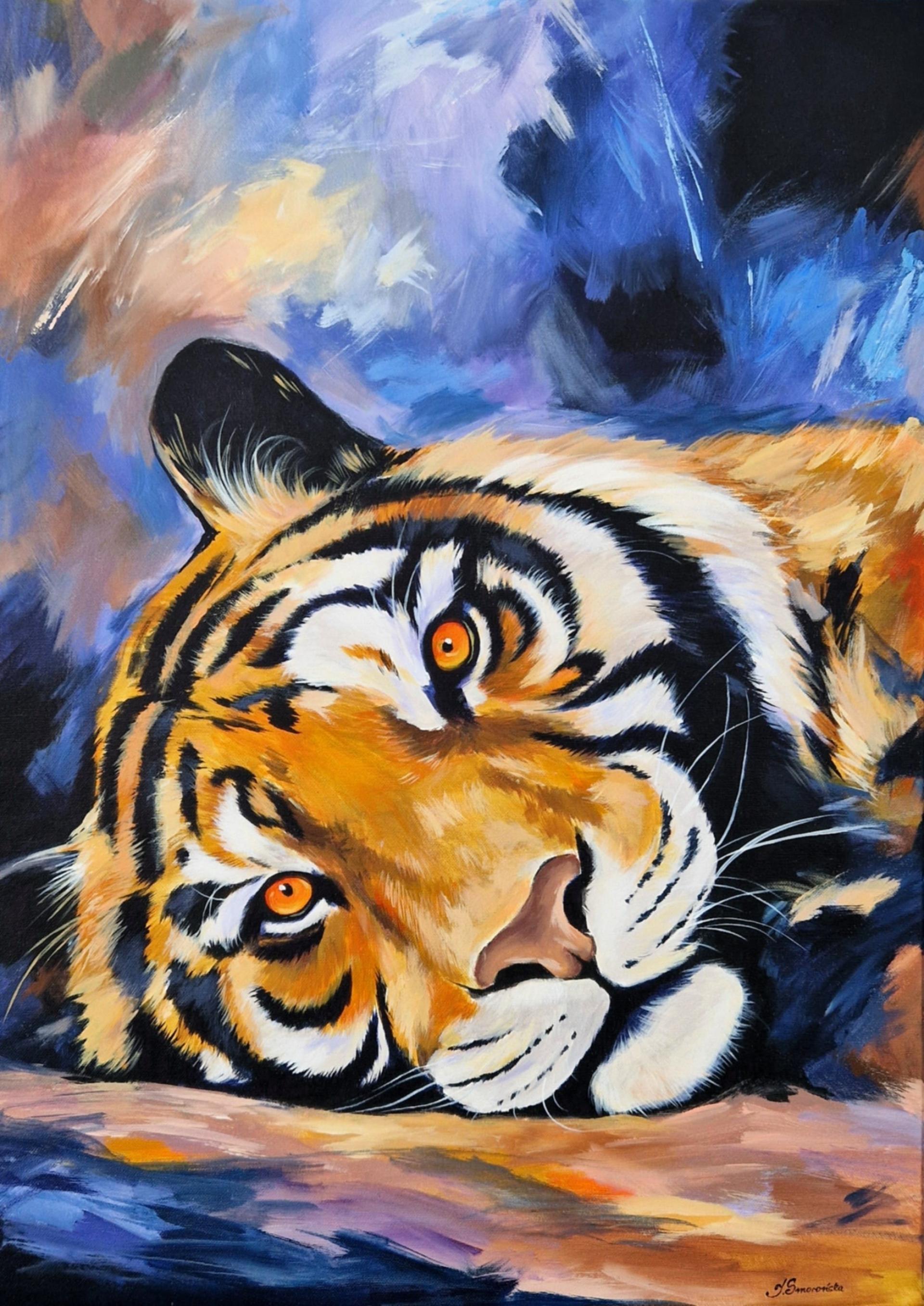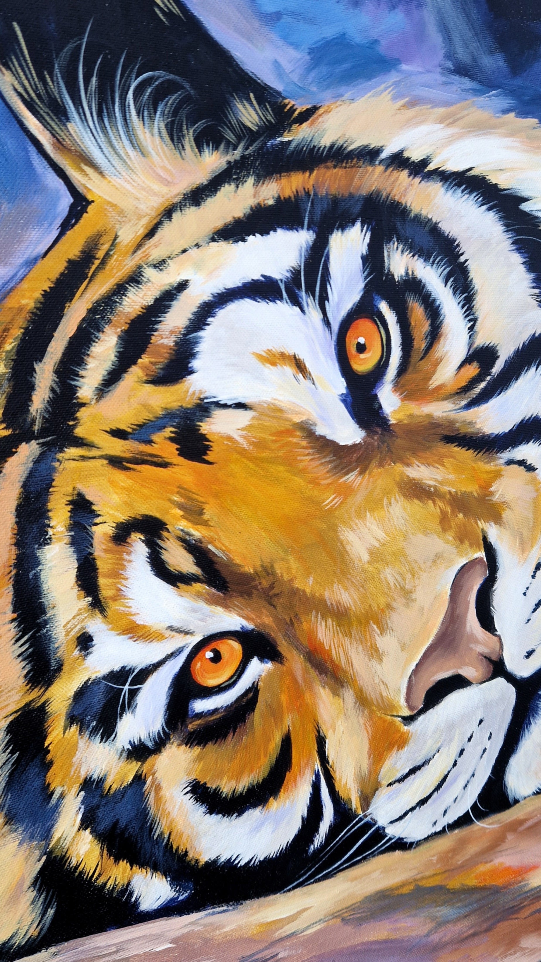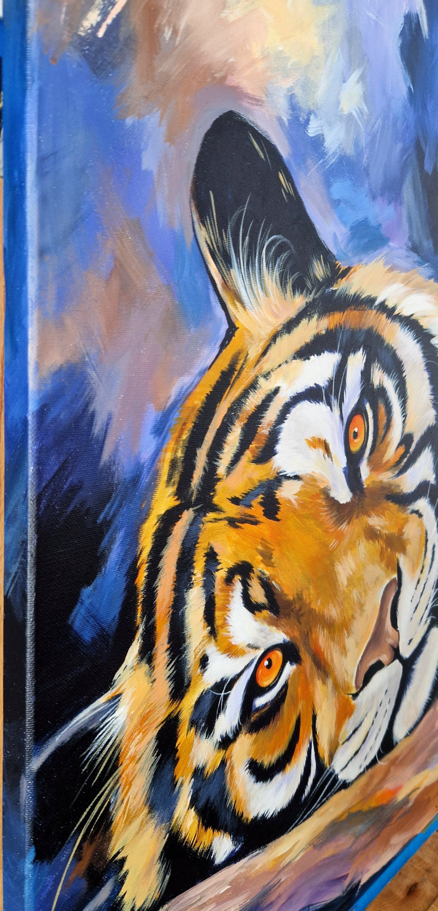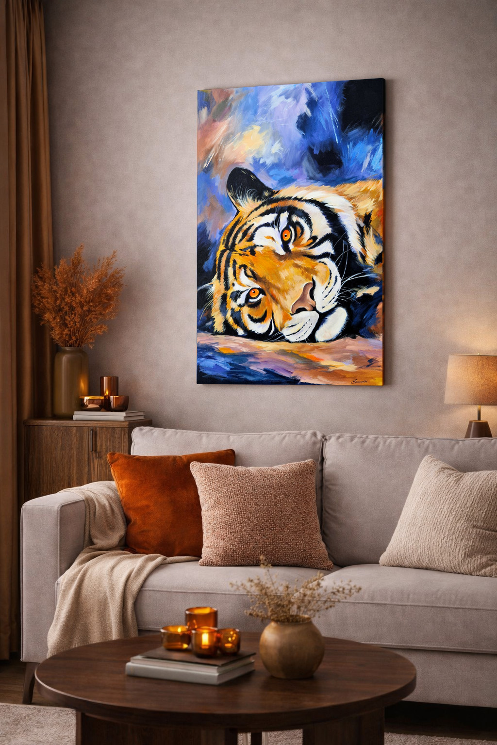 Kompozycja balansuje między dynamiką a spokojem, ukazując napięcie pomiędzy instynktem a opanowaniem. Ekspresyjna, malarska faktura oraz kontrastujące barwy — głębokie błękity, fiolety i rozświetlone pomarańcze — budują emocjonalne tło, które podkreśla majestat i symboliczny wymiar postaci. Tygrys staje się tu metaforą wewnętrznej mocy, odwagi i uważności — siły, która nie musi się manifestować ruchem. Obraz doskonale odnajdzie się we wnętrzach nowoczesnych, loftowych i eleganckich.