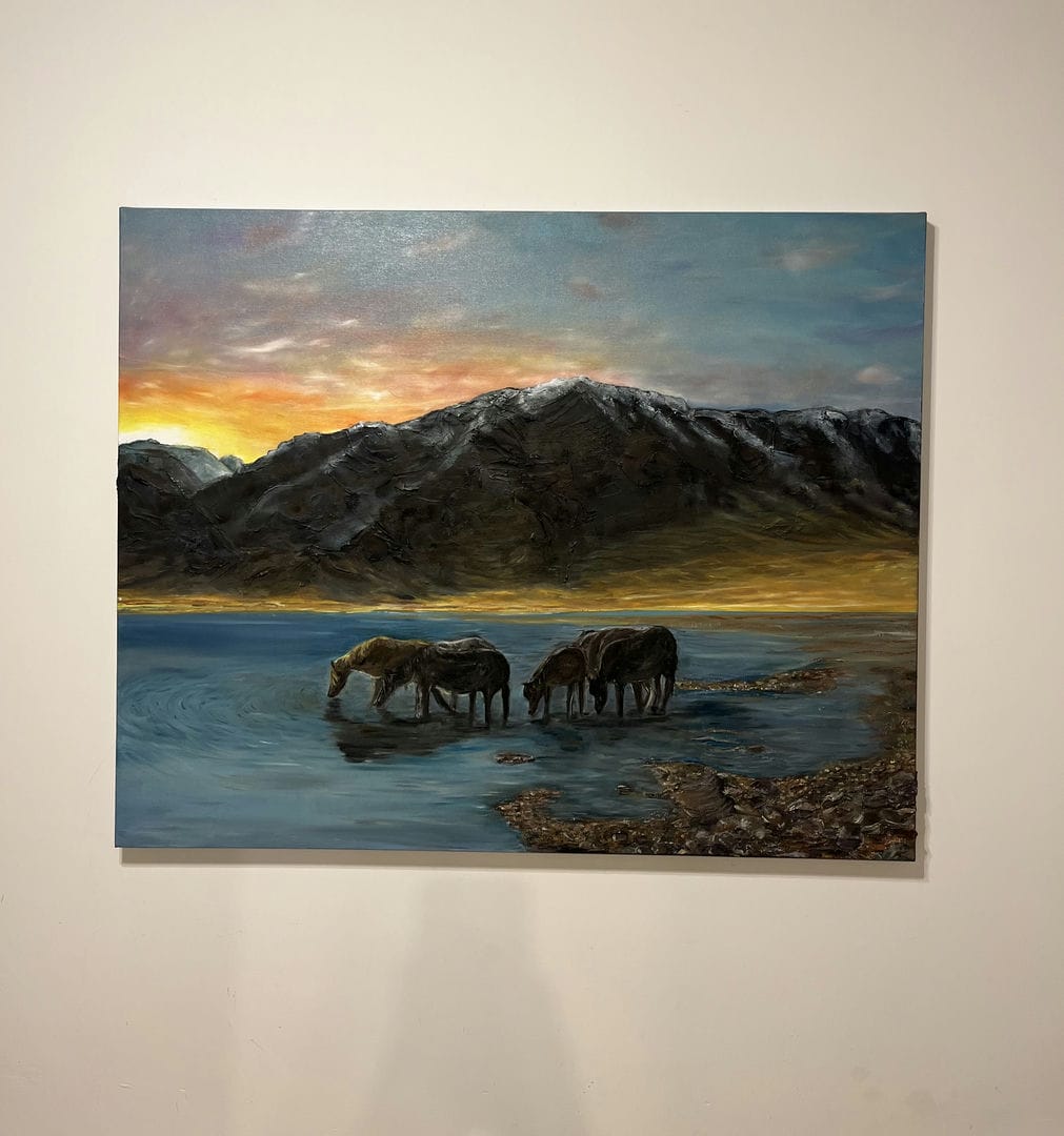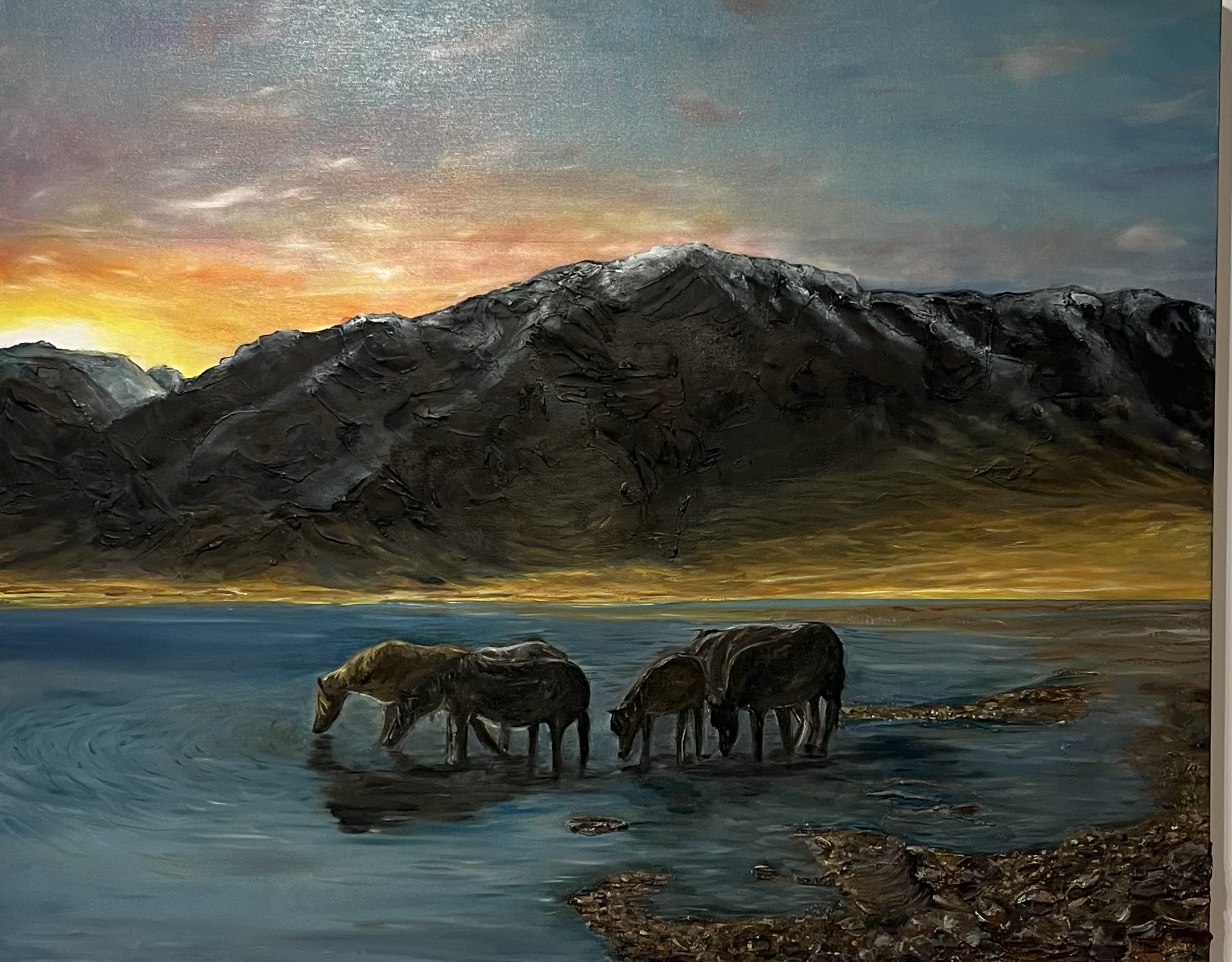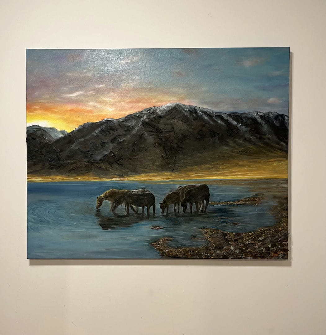Płótnó naciągnięte na blejtram.Olej,gips. 100x80cm Realistyczne pejzaż z duzym ładunkiem emocjonalnym. Konie stoją w wodzie, w świetle gasnącego dnia. Góry toną w błękicie, a niebo rozlewa się ogniem zachodu. Obraz oddycha spokojem natury. Woda odbija światło i ruch zwierząt. To hymn o harmonii, sile i ciszy, w której rodzi się pokój. Idealny akcent do salonu , do wnętrz, gdzie chce się po prostu odpocząć. Cena 1400 zł. Ten obraz to hołd dla wolności — dla piękna, które nie potrzebuje słów, by dotknąć serca.