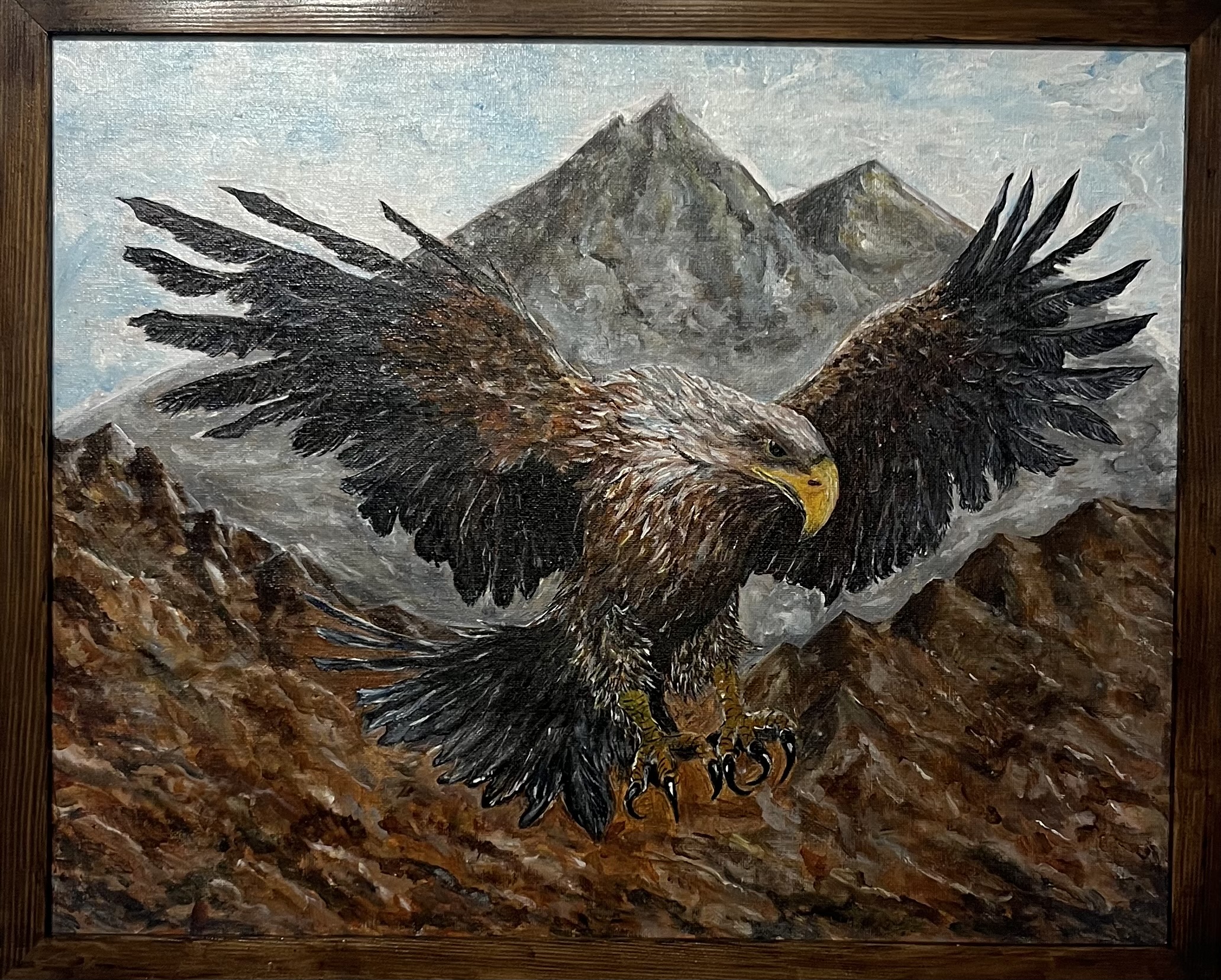 Płótnó naciągnięte na blejtram.Akryl.Rama.40x50cm Obraz przedstawia orła, który rozpościera skrzydła nad szczytami. Wiatr zdaje się płynąć przez płótno. Góry milczą, a on króluje nad nimi. To obraz o wolności i dumie, o odwadze wznieść się ponad lęk. Kolory ziemi i nieba splatają się w majestatyczną całość. Obraz ręcznie malowany , zabiezpieczony werniksem.Rama drewniana lakierowana. Idealny do salony,biura, gabinetu – przyciąga wzrok i dodaje wnętrzu charakteru. Cena 300 zł.