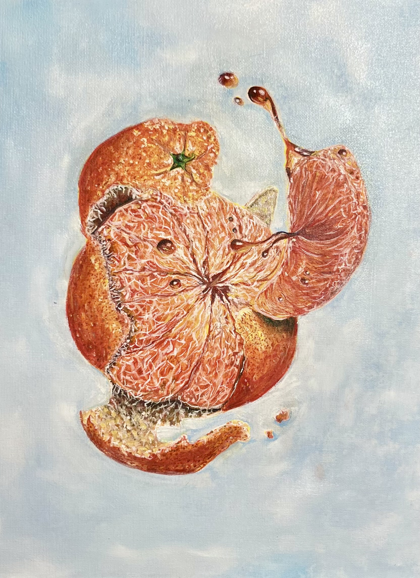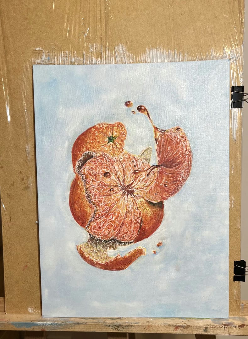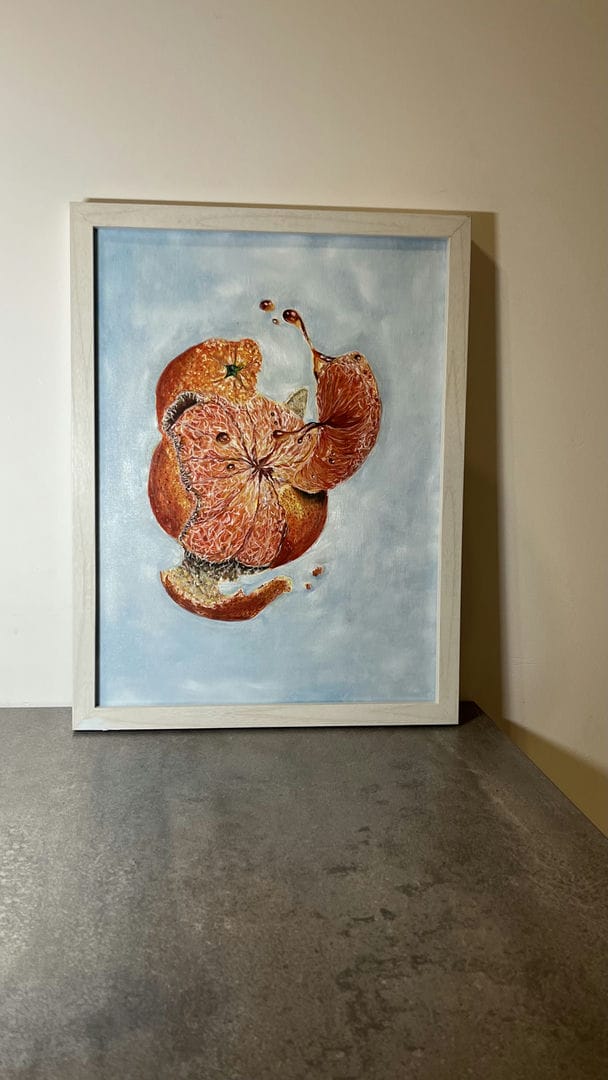 Dynamiczna i pełna życia kompozycja ukazująca moment eksplozji soczystości – pomarańcza zatrzymana w ruchu, pomiędzy realnością a gestem spontaniczności. Ciepłe, nasycone odcienie owocu kontrastują z chłodnym, subtelnym tłem, tworząc wrażenie świeżości i lekkości. Przenikające się refleksy światła i przejrzystość miąższu nadają obrazowi niemal zmysłowy charakter, a zarazem spokój i harmonię. Technika: olej na tablicy malarskiej Format: 30 × 40 cm Oprawa: drewniana rama