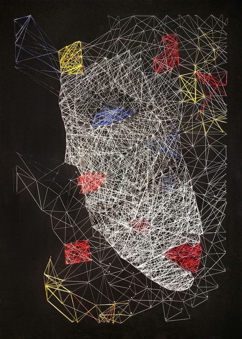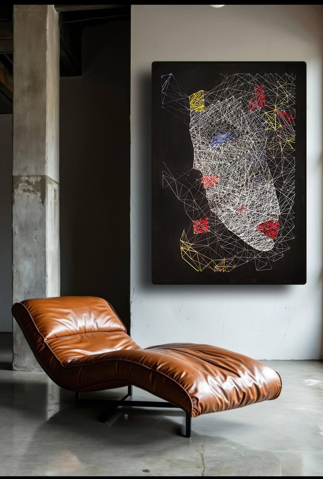 Ręcznie wykonany obraz stworzony w technice string art. Portret zbudowany z setek metrów kolorowych nici napiętych na starannie rozmieszczonych gwoździkach, tworzy wyjątkową, ekspresyjną kompozycję o silnym wyrazie emocjonalnym. Idealnie wpisuje się w nowoczesne wnętrza – przyciąga uwagę, intryguje i pobudza wyobraźnię. Specyfikacja: Technika: string art (nici + gwoździe) Podłoże: płyta MDF, malowana na czarno Wymiary: 70 × 100 cm Kolorystyka: kolorowe nici na czarnym tle Rama: brak