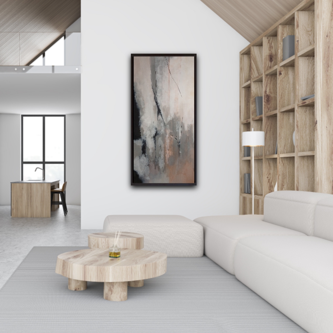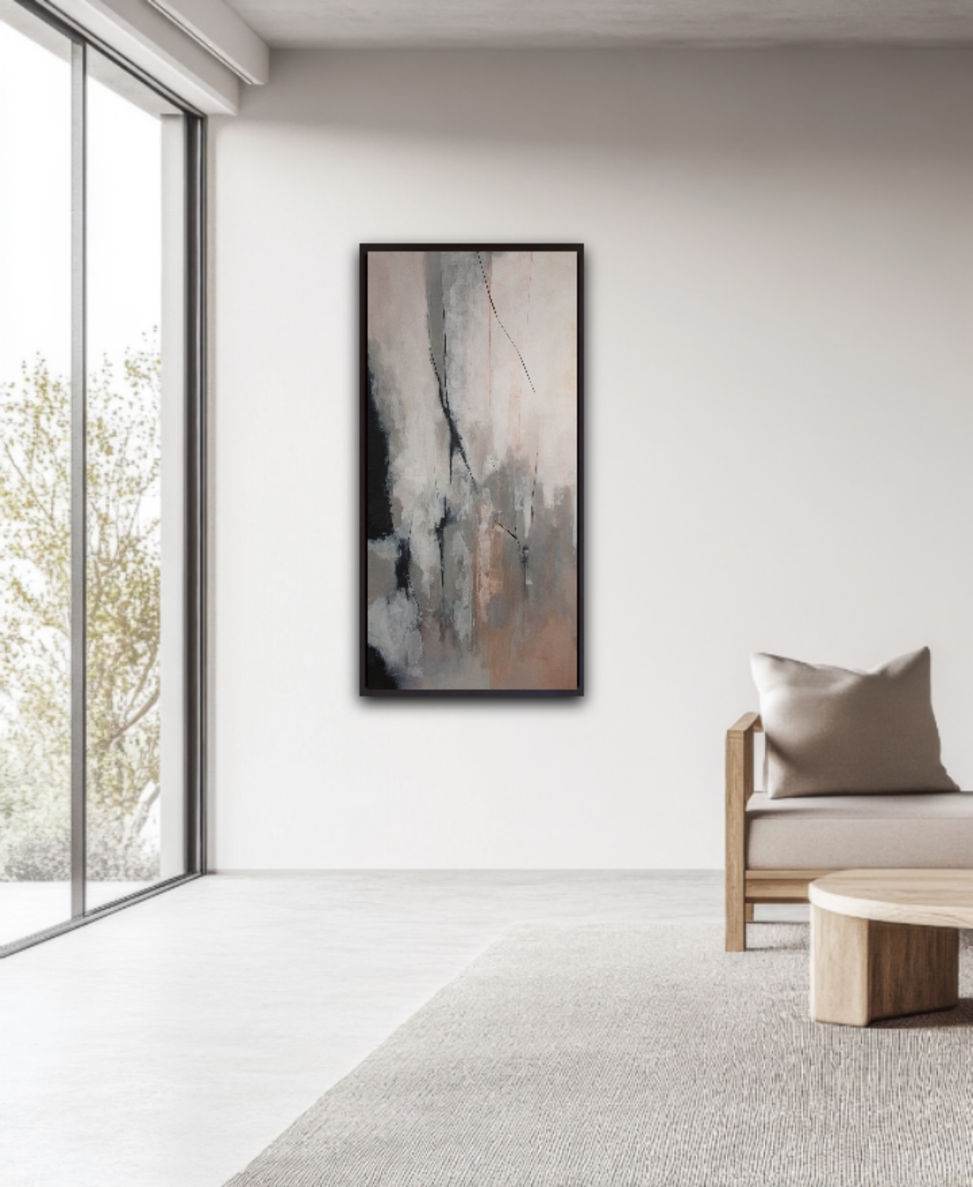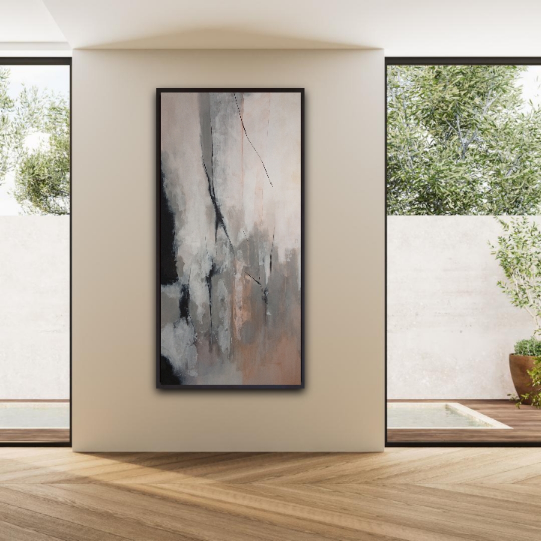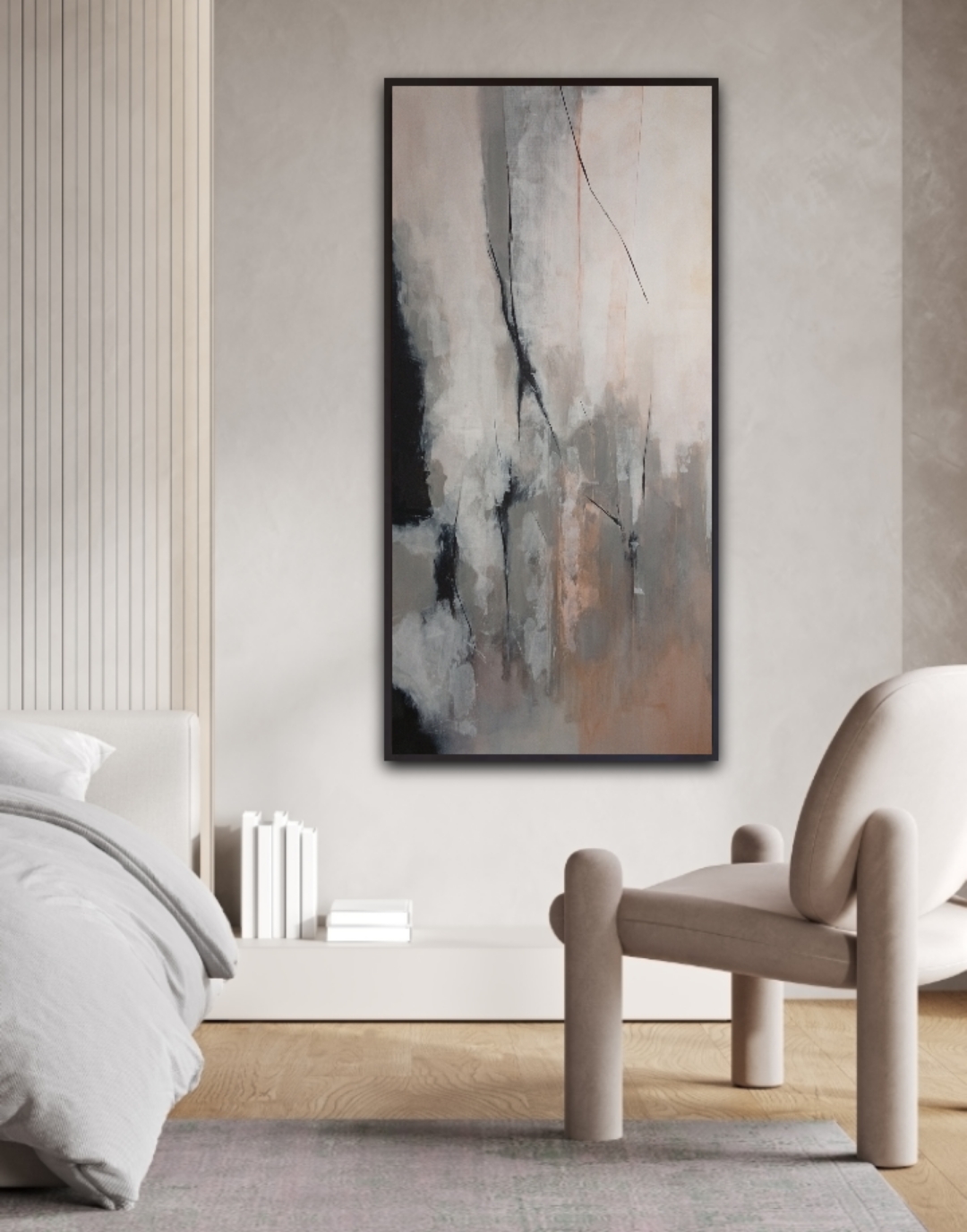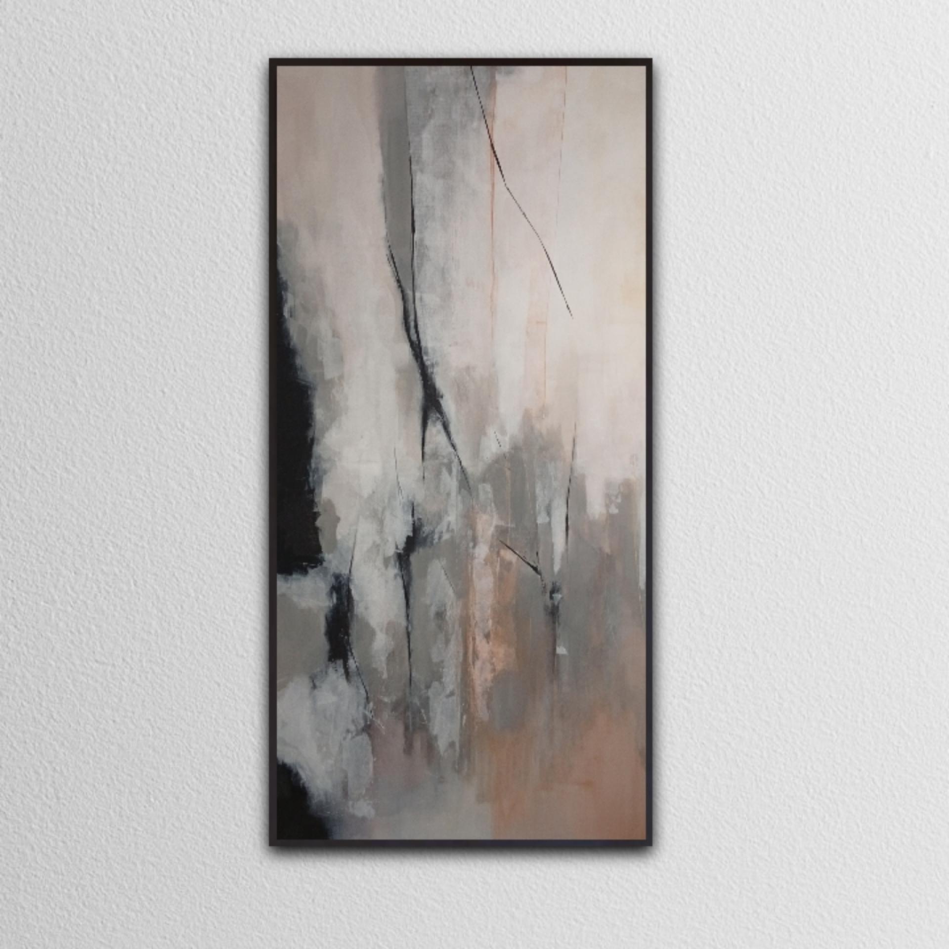 "Velum" to abstrakcyjna kompozycja inspirowana ciszą i ulotnością chwili. Delikatne przejścia szarości, beżu i bieli tworzą wrażenie mgły, w której zanikają granice między formą a emocją. Subtelne linie wprowadzają napięcie i kierunek, zachowując przy tym harmonię i równowagę. Obraz wnosi do wnętrza spokój, refleksję i głębię — idealny do przestrzeni, w której ważna jest atmosfera i światło. Akryl na płótnie, obrzeża zamalowane na czarno, zabezpieczony werniksem. Wymiary: 140 x 70 cm.